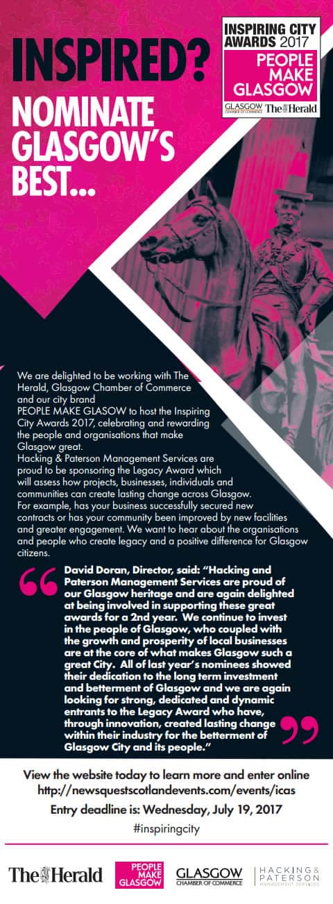 Hacking and Paterson Management Services are delighted to be once again supporting Glasgow’s “Inspiring City Awards” which launched today. The Awards celebrate the people who contribute to Glasgow’s cultural and economic climate, making it a truly thriving city.
