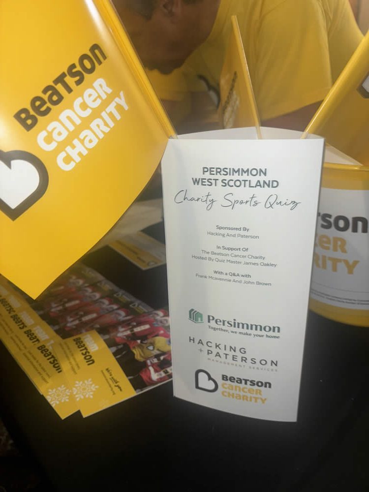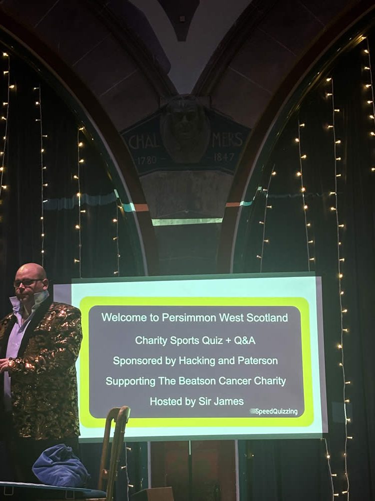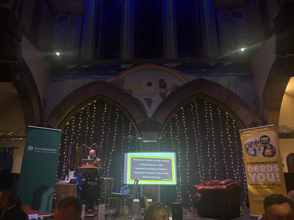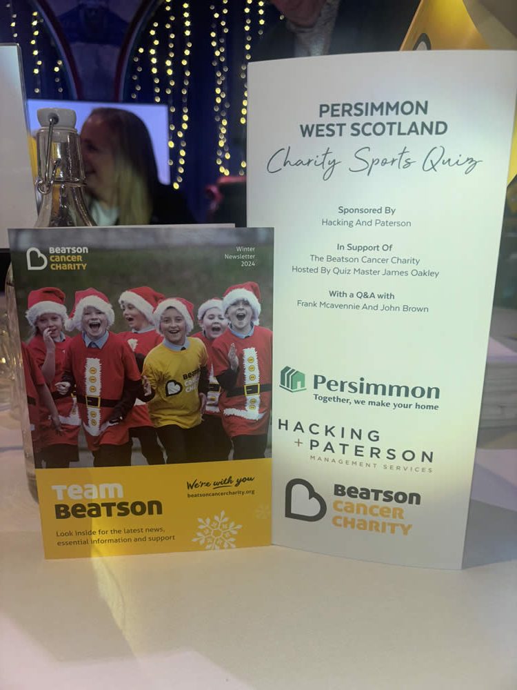 Last Friday, we had the pleasure of attending an unforgettable evening at Oran Mor, where Hacking and Paterson Management Services proudly sponsored the Persimmon Homes Charity Sports Quiz in support of the Beatson Charity. This isn’t our first time partnering with Persimmon for a charitable cause, and it’s always rewarding to be involved in events that bring the community together for a good purpose. The night filled with laughter, friendly competitiveness, and a shared commitment to making a difference in our community.